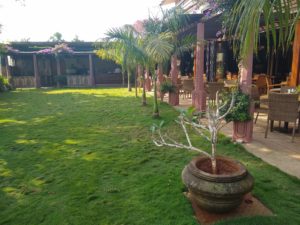 Vi äter frukost i en grön och sval trädgård med risfält och vackra blommor…det påminner mig mycket om Bali och Ubud…